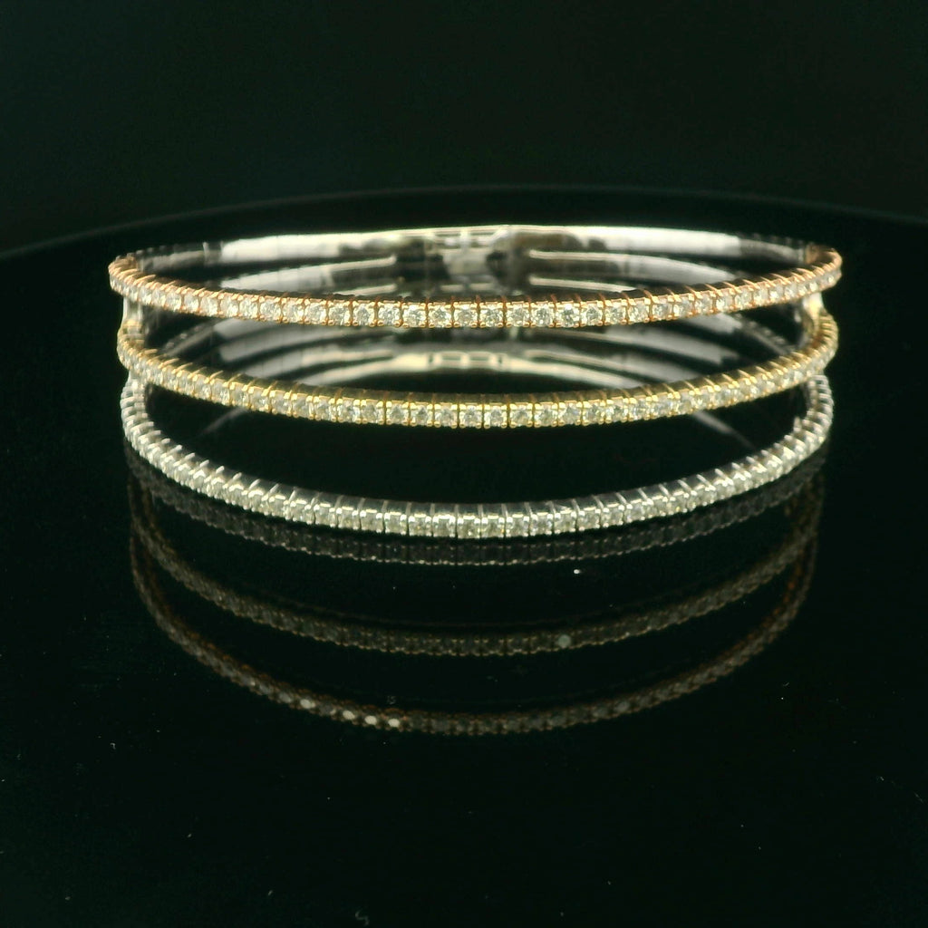 Elevate your style with this exquisite tri color 3.10cttw diamond tennis bracelet. Crafted in radiant 14k yellow, rose and white gold, the bracelet features a continuous stream of brilliant round cut diamonds. This design embodies timeless elegance and adds a touch of sophistication to any ensemble. Secure and comfortable, it's perfect for everyday wear or special occasions.