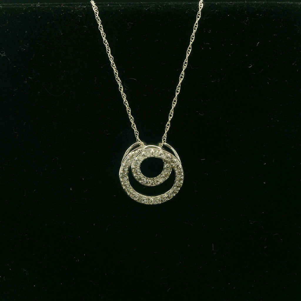 Elevate your ensemble with this exquisite 14k white gold necklace, showcasing a captivating .33cttw round brilliant cut diamond pendant. The pendant features an interlocking circle design. This pendant suspends from delicate chain. A timeless treasure for a touch of glamour.