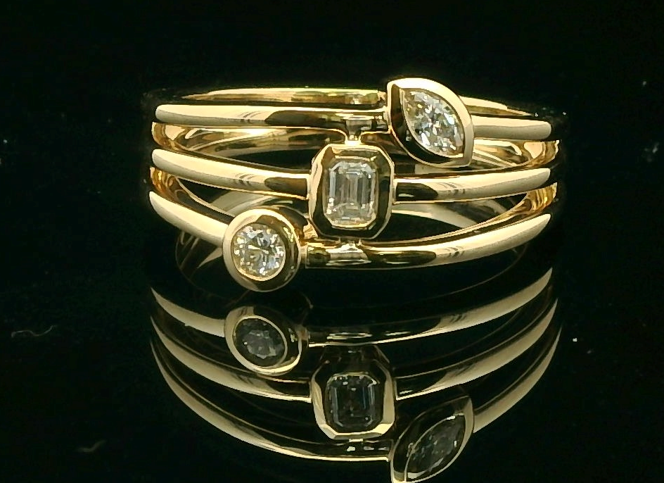 Embrace modern elegance with this 14k yellow gold multistone ring. The band showcases an exquisite arrangement of .24 cttw brilliant cut diamonds in varying shapes, set in a unique layered design. A stunning piece that adds a touch of sophisticated sparkle to any ensemble.