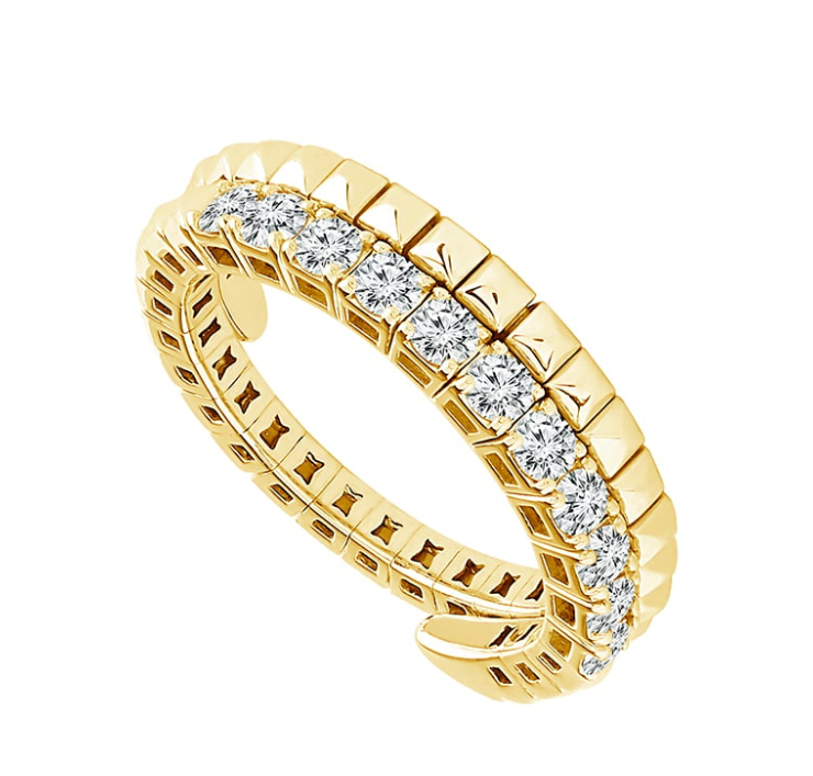 Fashion Jewelry of the future! This stunning 14k yellow gold flexible ring is meant for everyone, holding 1/2 cttw of diamonds, there is no sizing required, it stretches and shrinks around your finger to be the perfect fit! A stunning and beautiful gift for any special person in your life.