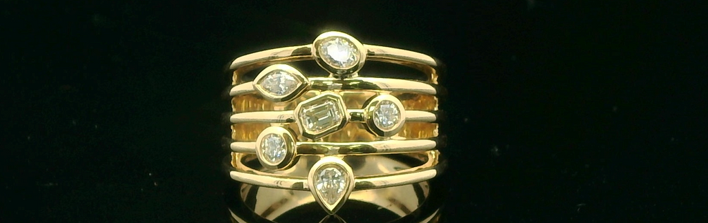 Elevate your jewelry collection with this exquisite multistone ring. Crafted in lustrous 14k yellow gold, this ring features a captivating arrangement of round, oval, emerald, pear and marquis cut diamonds. The unique design and impeccable craftsmanship make this ring a standout piece for any occasion.