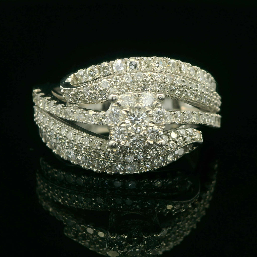 Exquisite multistone ring featuring 1CTTW of round brilliant cut diamonds set in gleaming 10K white gold. This luxurious design showcases remarkable brilliance and scintillation, making it a captivating addition to any jewelry collection. An ideal ring choice for celebrating love and creating lasting memories.