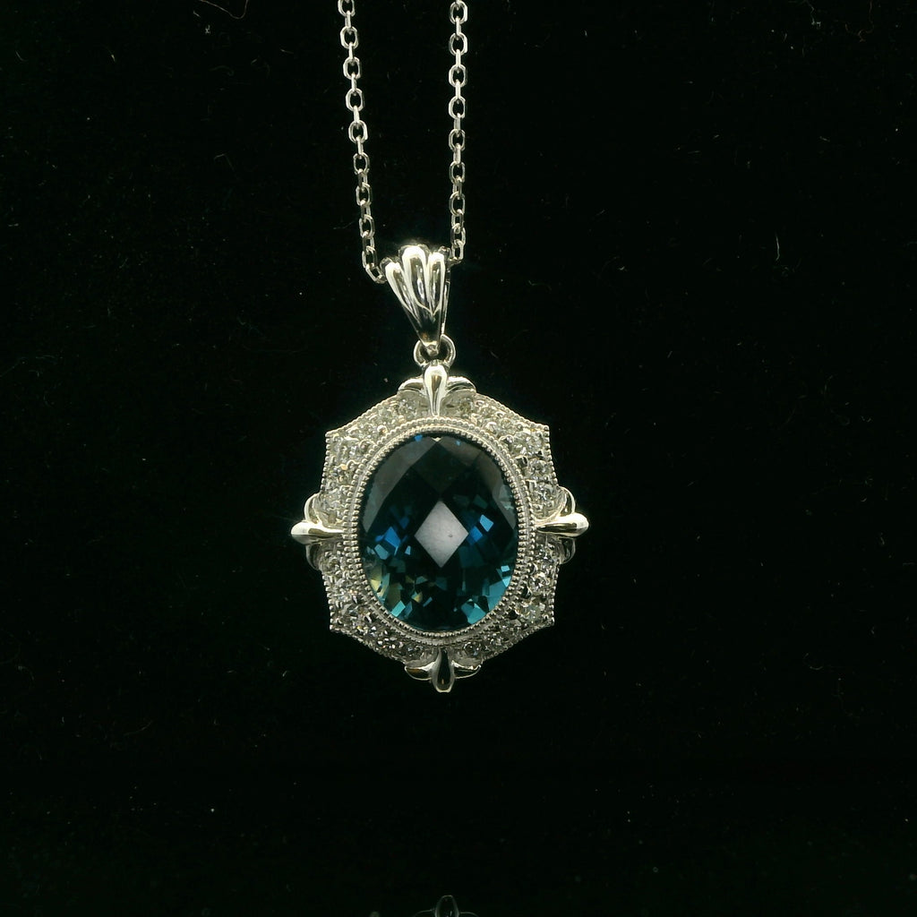Elevate your elegance with this exquisite necklace. Showcasing a captivating 3ct oval-cut London BlueTopaz, the pendant exudes sophistication. The fine 14k white gold work of this necklace is sure to capture attention, adding a touch of refined glamour to any ensemble. A perfect blend of classic design and modern appeal.