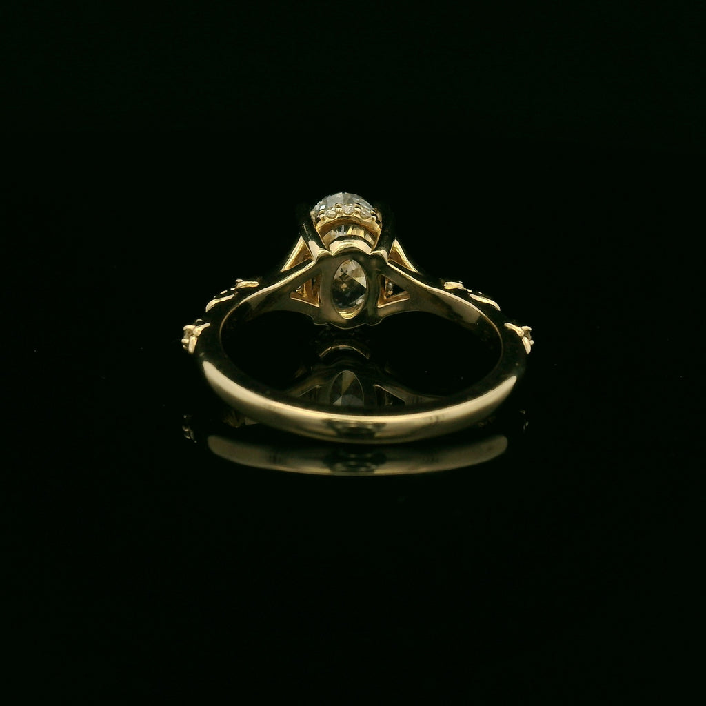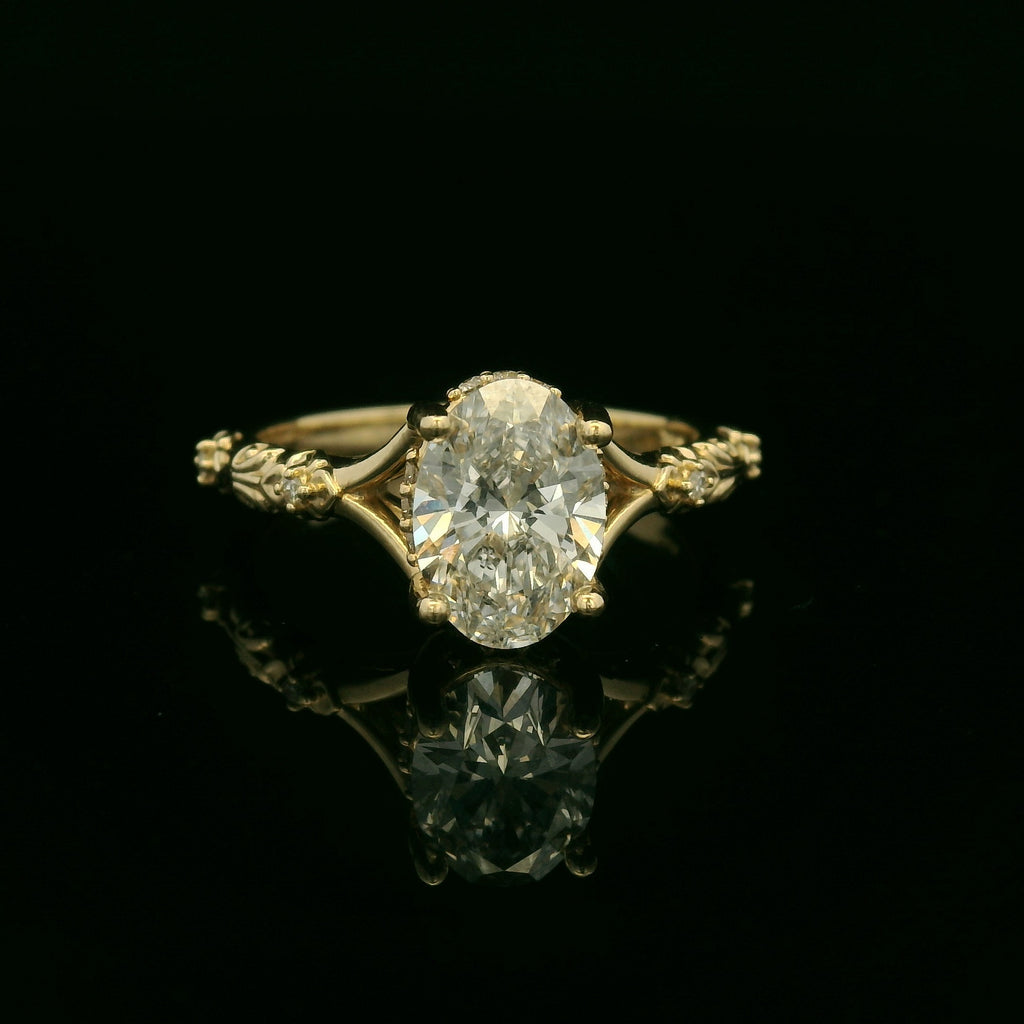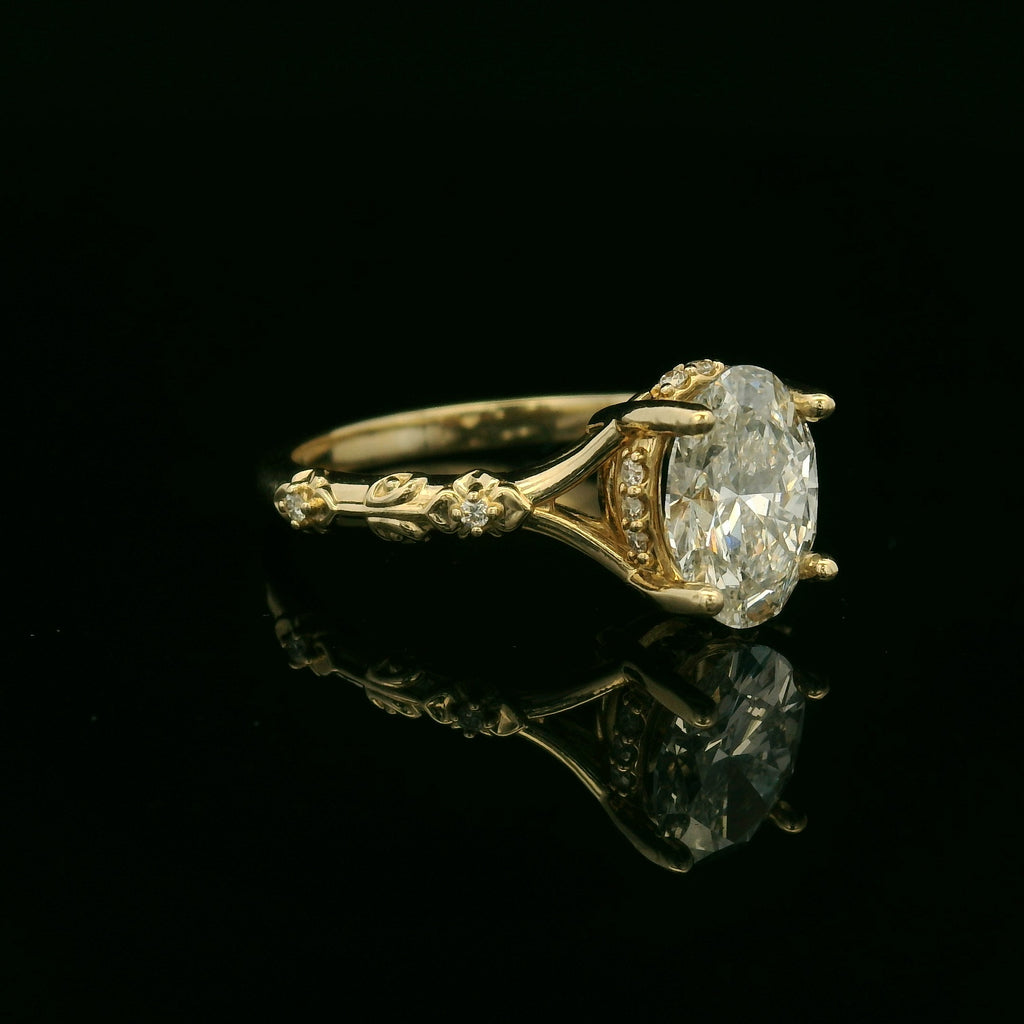 This stunning 14k yellow gold ring features an exquisite 1.5 carat lab grown oval diamond at its center, surrounded by delicate detailing that enhances its elegance. Perfect for engagements or special occasions, this piece radiates timeless beauty and sophistication.