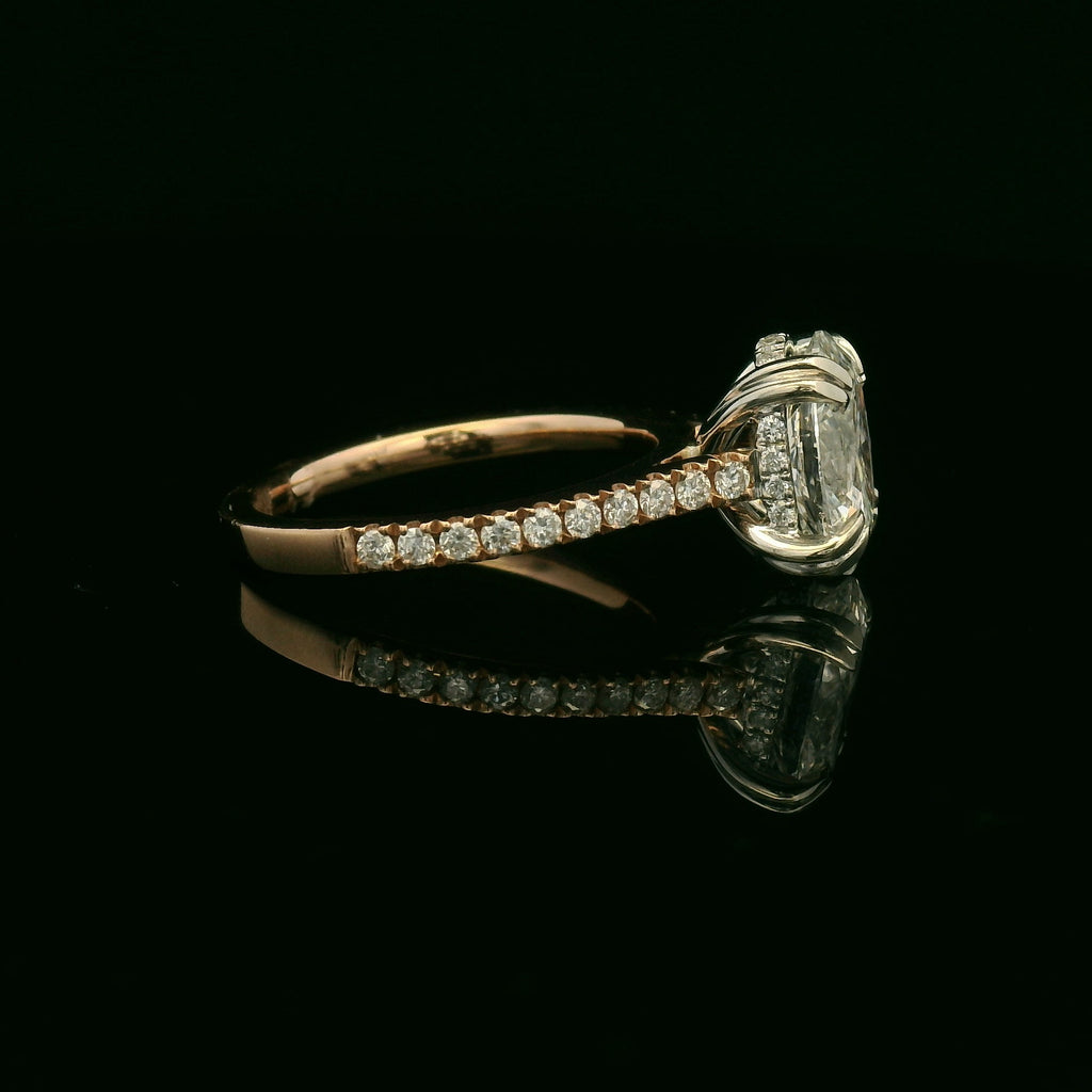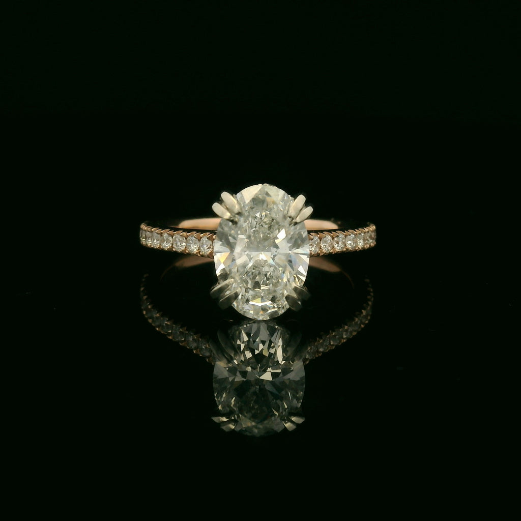 This is a solitaire ring featuring a central 2.04ct oval-cut lab grown diamond, characterized by its brilliant cut style. The ring is set in a 14k rose gold band with a white gold hidden halo, which is adorned with a series of smaller round diamonds along the shank, enhancing the overall brilliance and aesthetic appeal. The setting employs a four-prong design, ensuring secure placement of the central stone while allowing maximum light exposure. The polish of the ring is excellent, contributing to its reflective quality. The symmetry of the diamond and the arrangement of the smaller diamonds are also of high quality, ensuring a visually pleasing appearance.