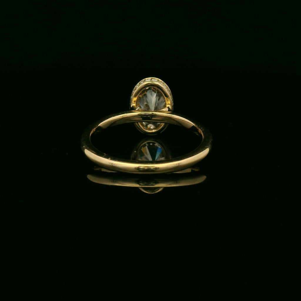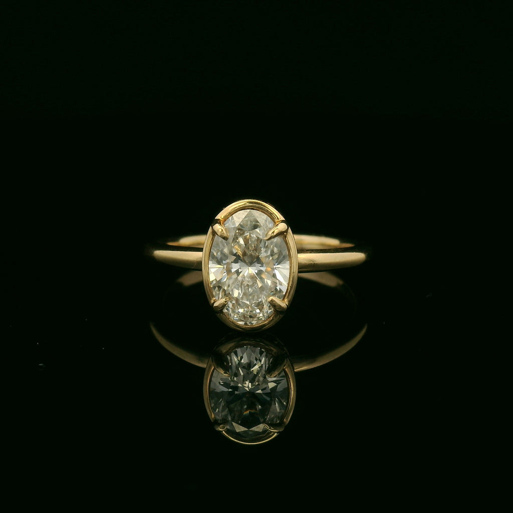 This stunning 14k yellow gold ring features a beautiful bezel oval lab grown diamond with a hidden halo that captures the light with every movement. Its elegant design and brilliant shine make it the perfect accessory for any special occasion, symbolizing love and commitment. 1.30cttw